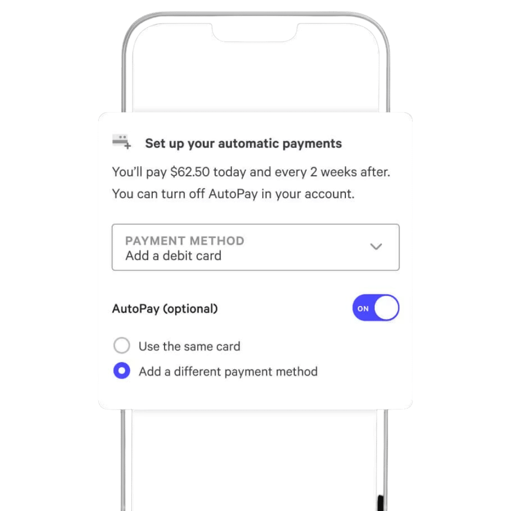 Manage your payments in the Affirm app or online, and set up AutoPay so you don’t miss a payment. But if you do, you’ll never pay any fees.